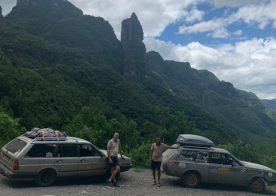 Cassiano Faria (dir.) e sua Belina 1989 em uma das três edições que já participou da Expedição Peabiru. Foto: Arquivo pessoal/ Cassiano Faria.