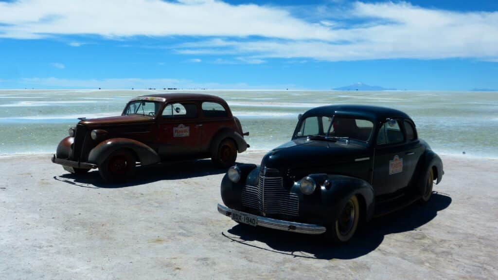 Os Chevrolets 1937 (esq.) e 1940 complementam a beleza do maior deserto de sal do mundo, o Salar Uyuni, na região de Potosí, na Bolívia. Foto: Arquivo Pessoal/ Aramis Schultz