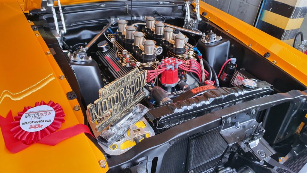 O clássico propulsor 351, de 6 litros, com quatro carburadores Weber 48 e dois kits de nitro era a cereja do bolo do Mustang Fastback 1969, de cor laranja e com faixas horizontais pretas, que chamava a atenção no box da MILITEC Brasil.